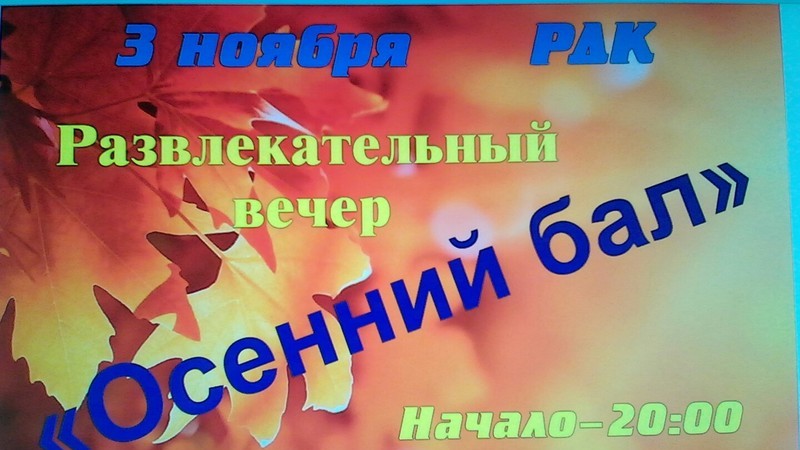 Уважаемые жители и гости района! Приглашаем Вас на торжественный вечер "Осенний бал", который состоится 3 ноября в 20.00 часов в районном доме культуры.