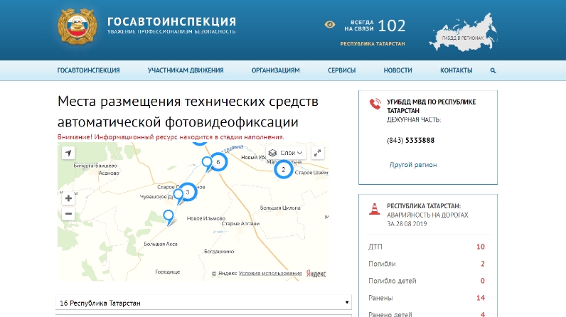 ГИБДД запустил в тестовом режиме новый интерактивный сервис, где собрана информация о местах размещения работающих в автоматическом режиме специальных технических средств, имеющих функции фото- и киносъёмки, видеозаписи для фиксации нарушений ПДД.