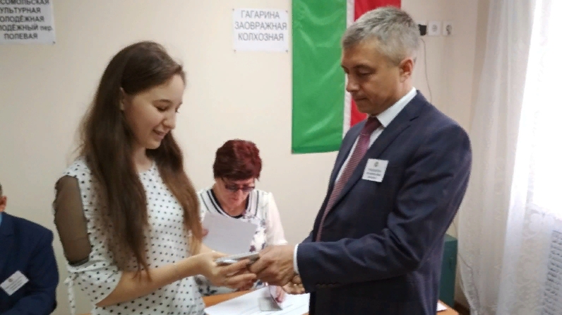 Сегодня 14 молодых жителей села Новое Дрожжаное впервые приняли участие в выборах, председатель избирательного участка Айваз Абязов вручил каждому из них памятные подарки.