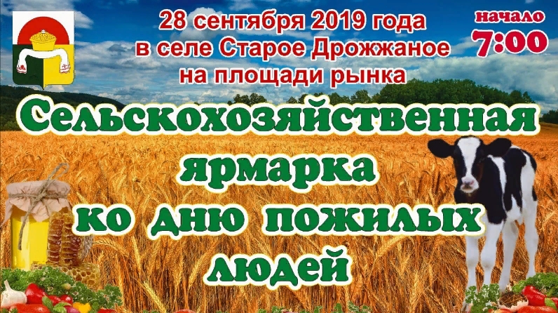 28 сентября 2019 года в 7:00 на площади рынка с.Старое Дрожжаное будет организована сельскохозяйственная ярмарка ко дню пожилых.