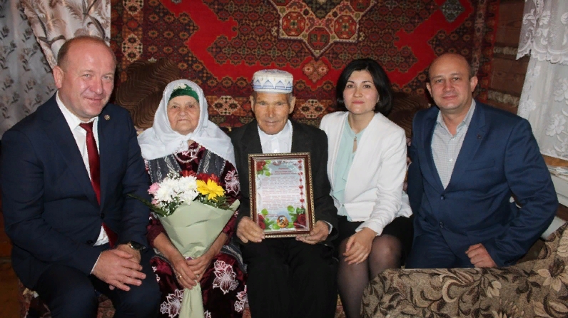 -Вы являетесь примером того, как через всю жизнь можно пронести тепло любящих сердец. Ваши отношения являются примером для нас, для молодежи, для ваших детей, внуков и правнуков. Искренне желаем вам крепкого здоровья и долгих лет счастливой жизни, - сказал Марат Ринатович, поздравляя супругов, и вручил им Благодарственные письма, цветы и подарки.