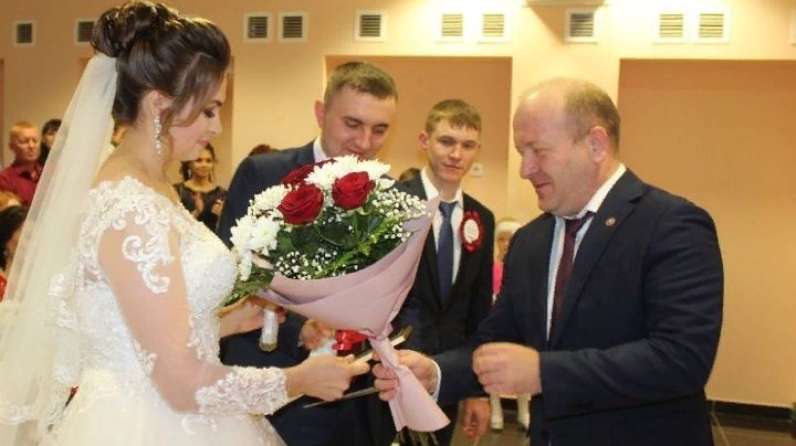 Счастливых молодоженов в торжественной обстановке поздравил Глава района Марат Гафаров. Виновникам торжества Марат Ринатович вручил их первый семейный документ - свидетельство о регистрации брака и подарок, пожелал счастливой и долгой сeмейной жизни.