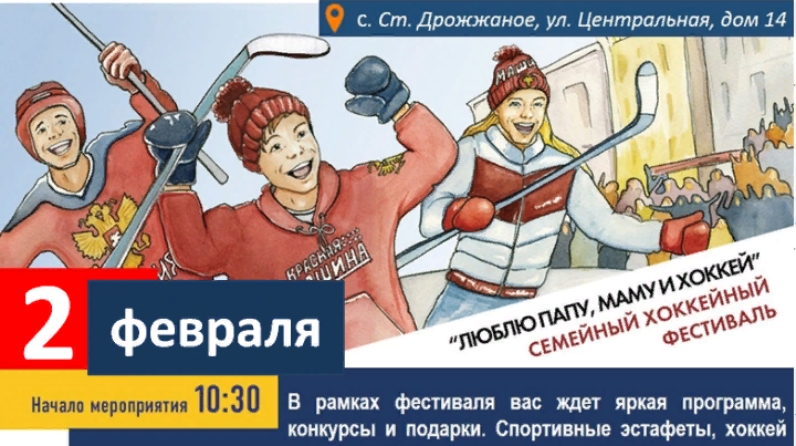 2 февраля 2020 года в селе Старое Дрожжаное пройдёт семейный хоккейный фестиваль "ЛЮБЛЮ ПАПУ, МАМУ И ХОККЕЙ".