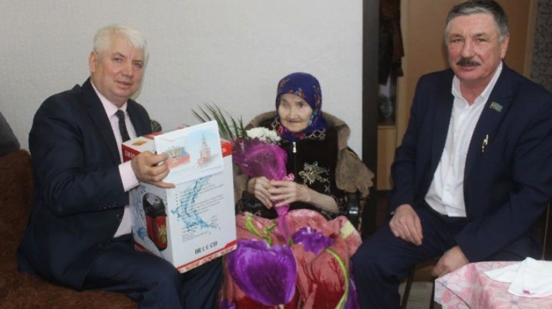 В рамках празднования 75 летия Победы в Великой Отечественной войне, 100 летия ТАССР и проекта "У войны не женское лицо", заместитель Главы района Алексей Ярухин и глава Матакского сельского поселения Валерий Михайлов поздравили юбиляра, и от имени Президента России В.В.Путина вручили поздравительное письмо, а также от имени Главы района вручили памятный подарок.
