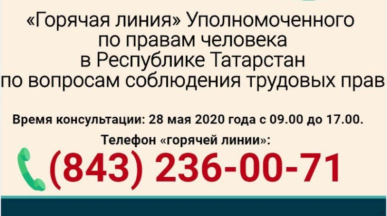 Получить исчерпывающую информацию, разъяснить спорные ситуации гражданам помогут представители Уполномоченного по правам человека в Республике Татарстан, Прокуратуры Республики Татарстан, Министерства труда, занятости и социальной защиты Республики Татарстан и Государственной инспекции труда по Республике Татарстан.
