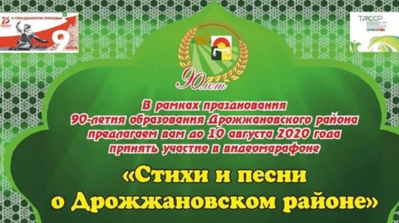 В рамках празднования 90-летия образования Дрожжановского района стартует видеомарафон, где каждый житель сможет принять участие. Для этого необходимо записать видеоролик с песней или же со стихотворением о Дрожжановском районе на любом языке.