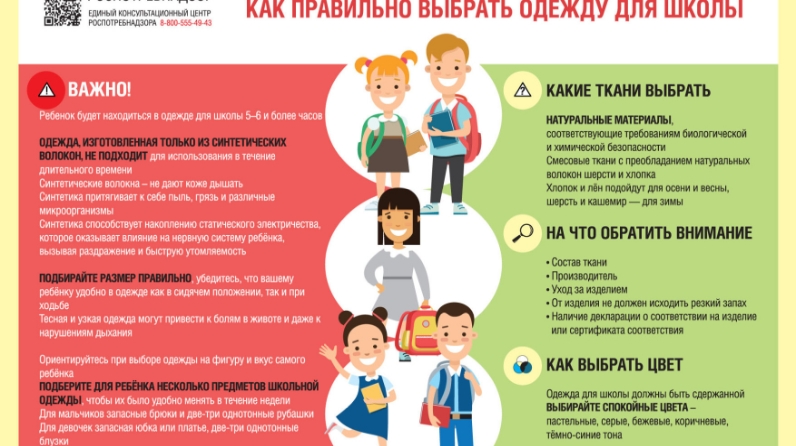 В преддверии нового учебного года Роспотребнадзор напоминает, что в первую очередь одежда для школы должна обеспечить сохранение детского здоровья. Родителям при приобретении школьной одежды для ребёнка важно помнить, что в ней он будет проводить 5–6 и более часов. В связи с этим, необходимо понимать, что одежда для школы, которая состоит только из синтетических волокон для этих целей не подойдет. Следует выбирать смесовые ткани с небольшим содержанием синтетических волокон.