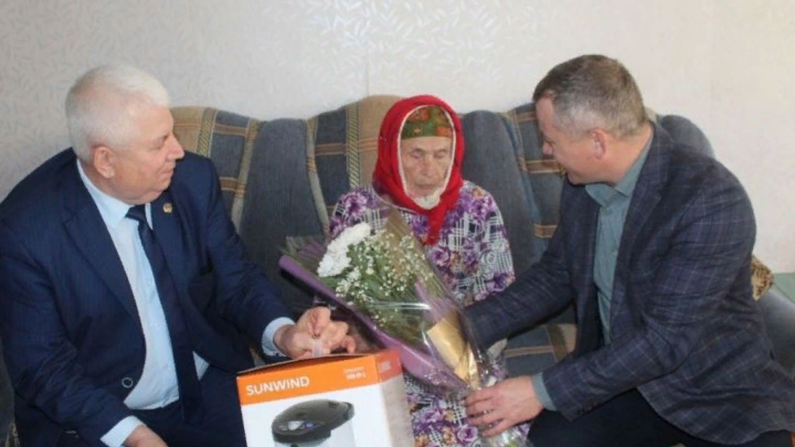 Алексей Ярухин и Рамиль Низамов вручили юбилярше персональное поздравление, памятный подарок от имени главы района Марата Гафарова и цветы. Гости пожелали юбилярше долголетия и крепкого здоровья.