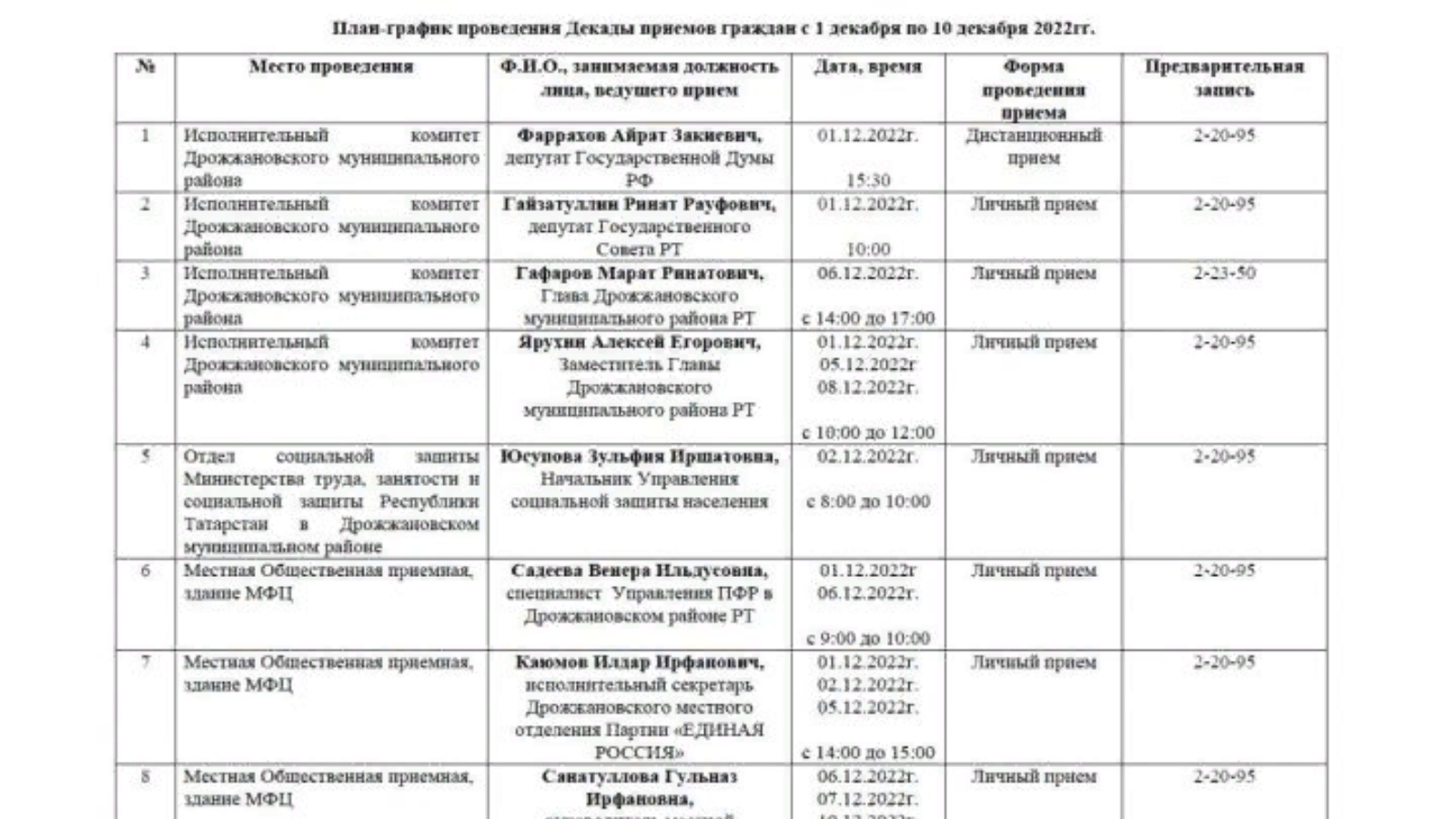 Прием будут вести депутат ГД РФ Фаррахов А.З., депутат ГС РТ, Гайзатуллин Р.Р., Глава Дрожжановского района РТ Гафаров М.Р., заместитель Главы Дрожжановского муниципального района РТ Ярухин А.Е., начальник Управления социальной защиты Юсупова З.И., специалист Управления ПФР Садеева В.И., исполнительный секретарь Дрожжановского МО Партии Каюмов И.И., Руководитель МОП Санатуллова Г.И.