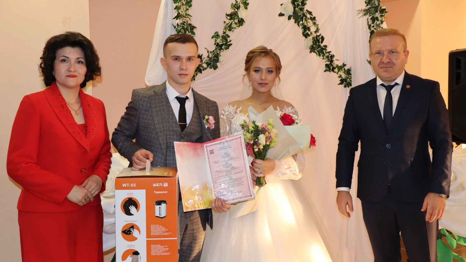 – Мы сегодня стали свидетелями создания новой семьи. Желаю вам семейного уюта, счастья, уважения, здоровья и чтоб дожить до старости в понимании и согласии, - сказал он, вручив их первый семейный документ – свидетельство о бракосочетании и подарок на память.
