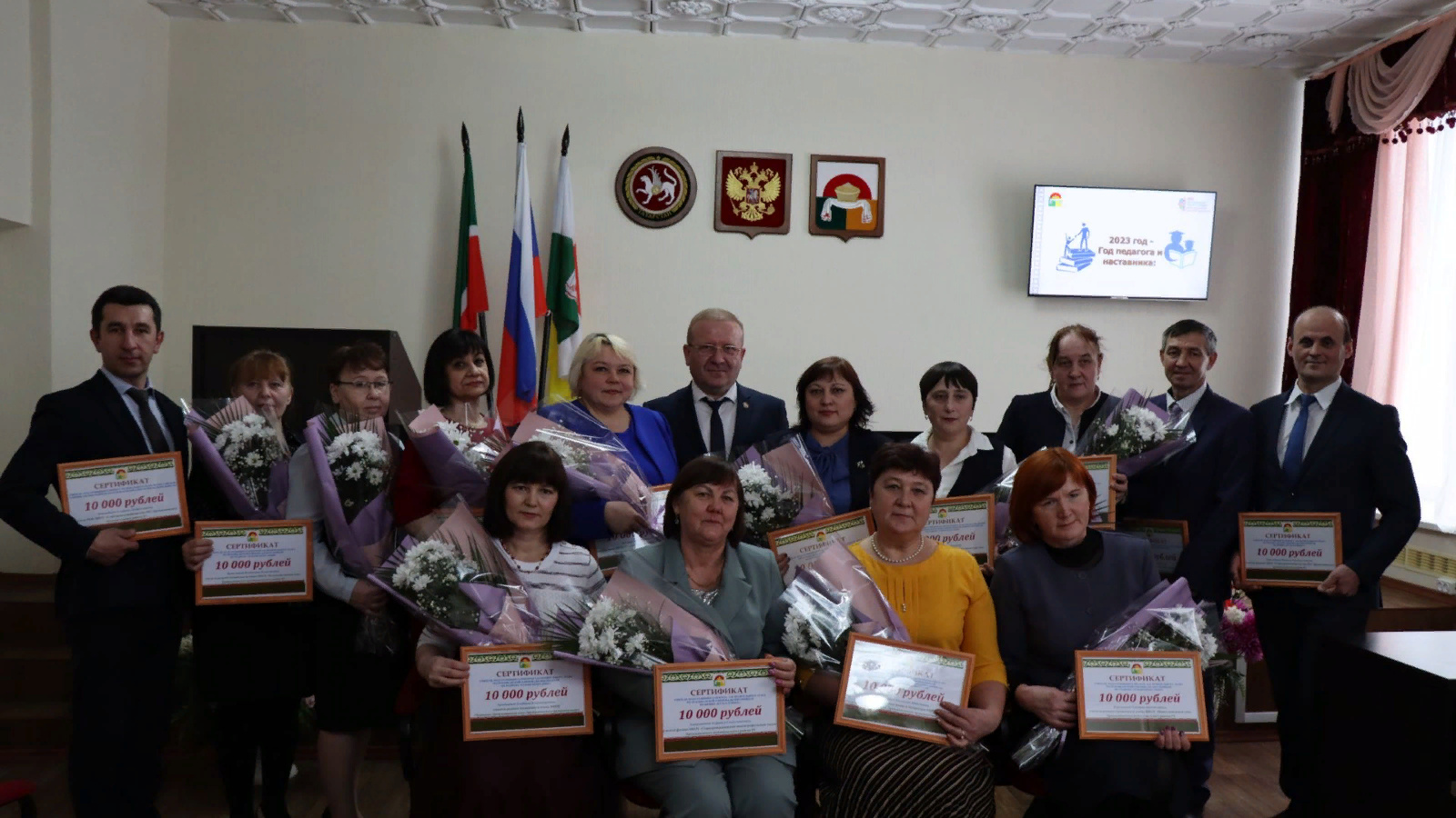 Сертификатом в 10 тысяч рублей были награждены Надежда Старшова, педагог русского языка Матакской СОШ, Альфик Миннебаев, педагог по ОБЖ Стародрожжановской СОШ №1, Сергей Одинцов, педагог по технологии Стародрожжановской СОШ №1, Валентина Ярмушова и Нина Ларионова, педагоги по чувашскому языку Большеаксинской СОШ, Татьяна Карсакова, педагог по чувашскому языку Новоильмовской СОШ, Валентина Петрова, Альбина Артемьева, педагоги по чувашскому языку Чувашско-Дрожжановской СОШ, Надежда Сердцева, педагог по чувашскому языку Убеевской СОШ, Эльмира Яфизова, педагог по английскому языку Стародрожжановской СОШ №1, Миляуша Фатхуллина, педагог по татарскому языку Старошаймурзинской СОШ, Лейсан Ханбикова, педагог по русскому языку Старошаймурзинской СОШ, Елена Митрошкина, педагог по английскому языку Большеаксинской СОШ, Алфинур Амирханова, педагог по физике Стародрожжановский многопрофильный лицей, Шамиль Тазетдинов, педагог по физике Стародрожжановский СОШ №1, Ирина Ильина педагог по химии, Стародрожжановский многопрофильный лицей.