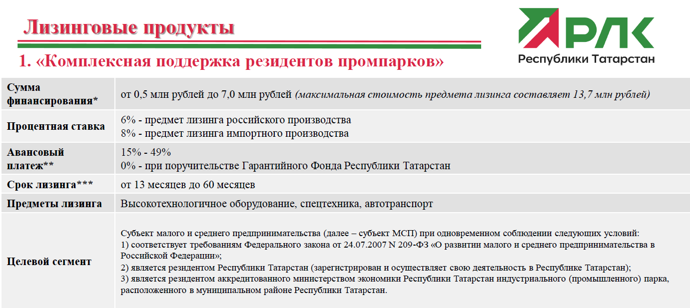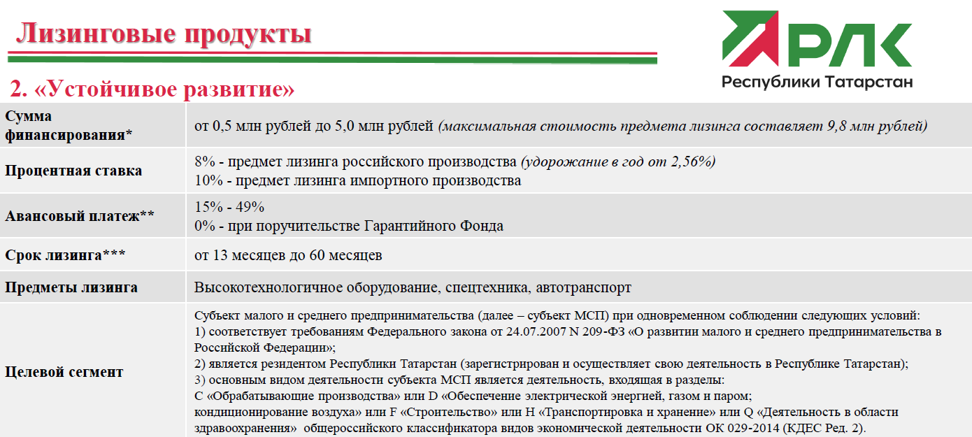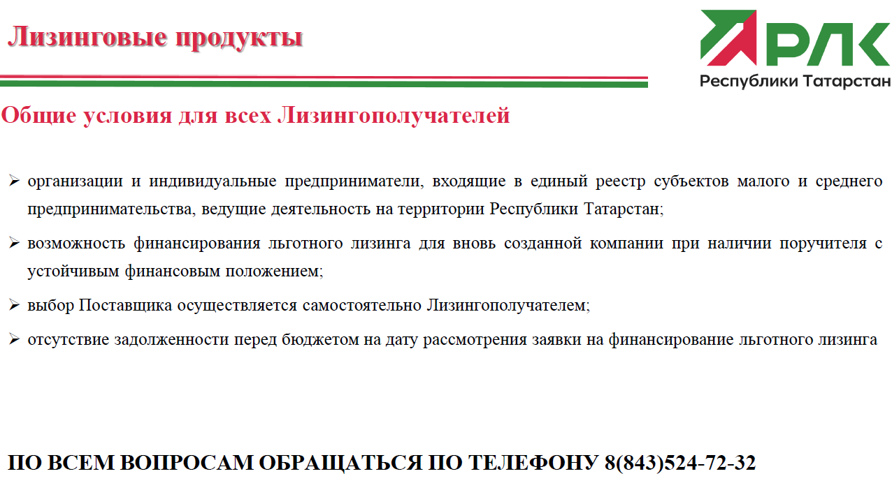 Предмет лизинга: оборудование (новое ранее неиспользованное или не введенное в эксплуатацию), спецтехника, грузовой транспорт, пассажирский транспорт, легковой коммерческий транспорт.