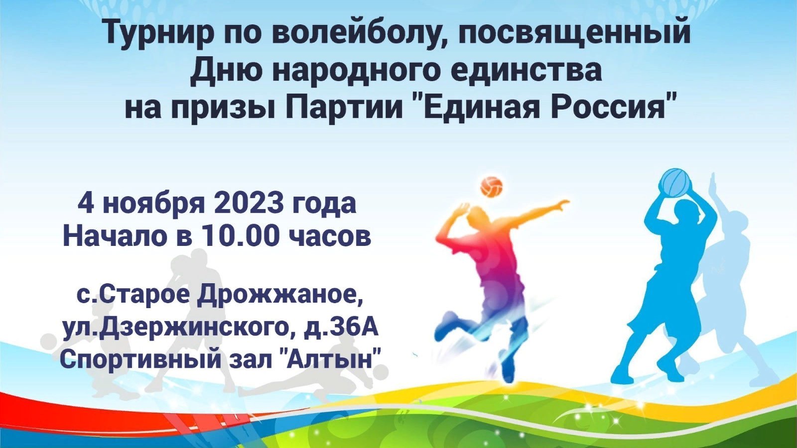 4 ноября 2023 года в универсальном спортивном зале «Алтын» села Старое Дрожжаное состоится открытый турнир по волейболу среди мужских команд на призы Партии «Единая Россия», посвященный Дню народного единства. Для участия в турнире приглашаются команды соседних районов Республики Татарстан, Ульяновской области, Чувашской Республики и сельских поселений нашего района.
