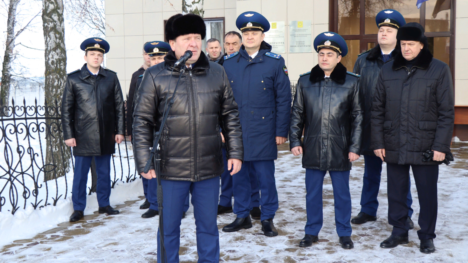 Глава района Марат Гафаров, заместитель прокурора РТ, старший советник юстиции Ильнур Ибрагимов, прокурор Дрожжановского района Олег Гайнетдинов, сын Сайфихана Нафиева Гумер Нафиев, заместитель руководителя следственного управления Следственного комитета РФ по РБ Ильяс Масаллимов, совместно с сотрудниками прокуратуры заволжской зоны РТ, возложили цветы к мемориальной доске экс-прокурора Республики Татарстан Сайфихана Нафиева. Мемориальная доска установлена на стене здания прокуратуры Дрожжановского района.