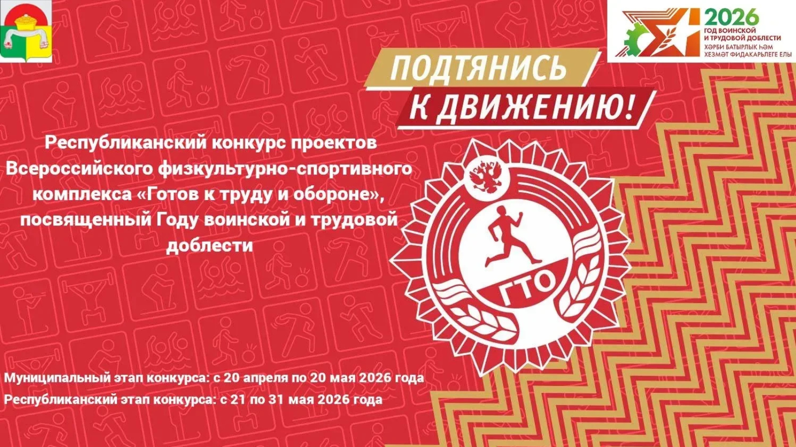 В целях привлечения внимания детей к героическим страницам в истории России, увековечивания мужества защитников Отечества и самоотверженного труда тружеников тыла, сохранения исторической памяти и популяризации комплекса ГТО с 20 апреля по 31 мая 2026 года проводится Республиканский конкурс проектов комплекса «Готов к труду и обороне», посвященный Году воинской и трудовой доблести.