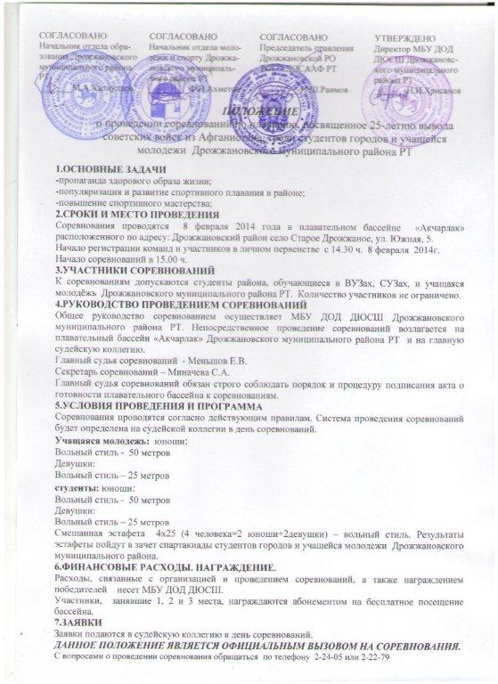 8 февраля 2014 года в плавательном бассейне “Акчарлак”, в рамках спартакиады студентов высших учебных заведений и учащихся молодежи проводится соревнования по плаванию среди студентов и студенток, а так же старшеклассников средних общеобразовательных школ района посвященные к 25 летию вывода войск Советской Армии из Афганистана.