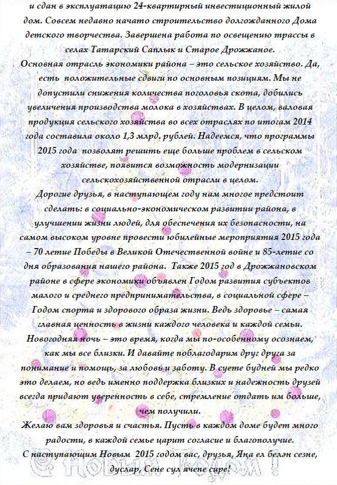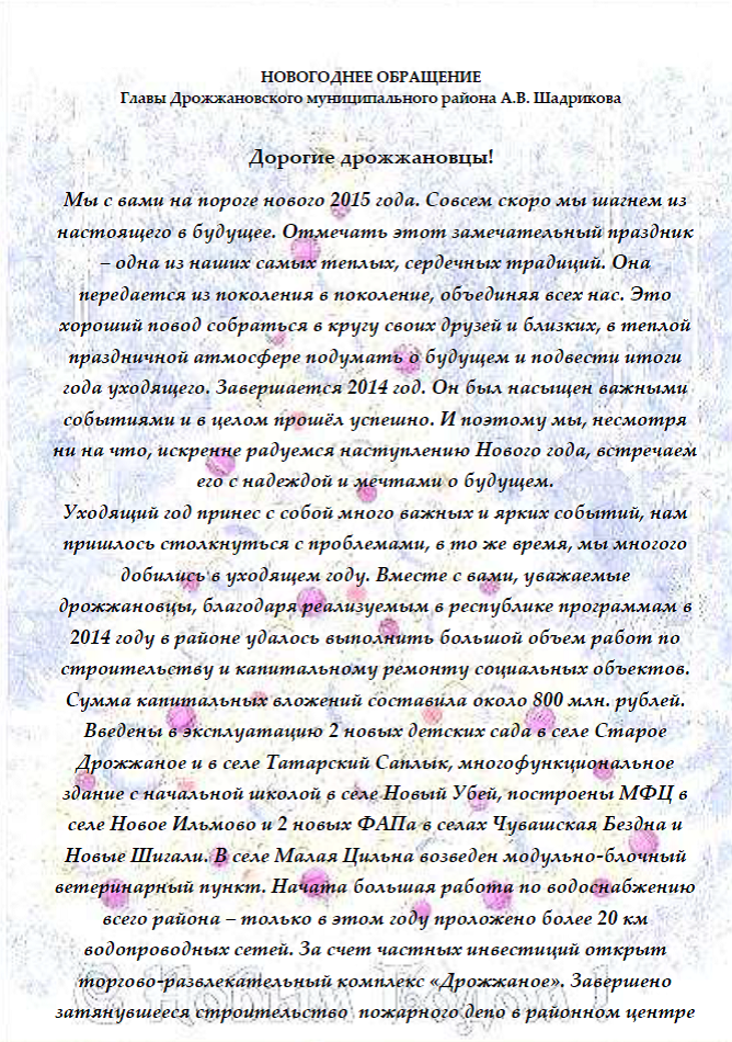 Новогоднее обращение Главы Дрожжановского муниципального района А.В. Шадрикова