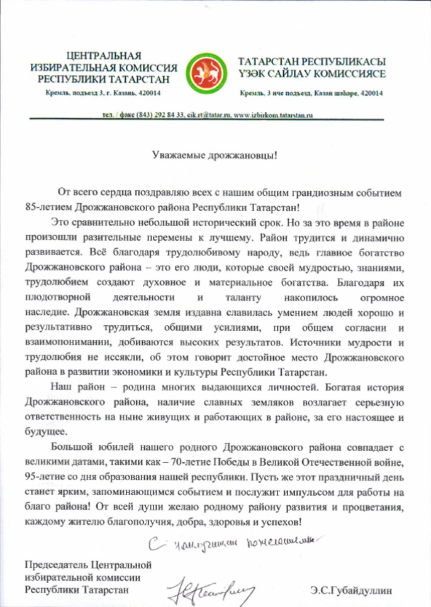Поздравление Губайдуллина Экзама Саматовича с юбилеем района