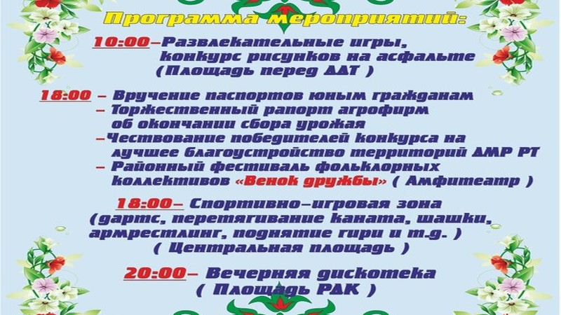 Хөрмәтле райондашлар! Сезгә Республика һәм Район көненә багышланган бәйрәм чаралары программасын тәкъдим итәбез!