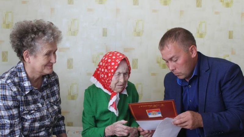 Авылының иң өлкән кешесен бер гасырга тиң гомер бәйрәме белән тәбрикләргә район Башкарма комитеты җитәкчесе урынбасары Данис Сатдинов һәм авыл җирлеге башлыгы Виктор Григорьев та килгән иде. Алар юбилярга ихлас теләкләрен ирештереп, исәнлек-саулык, бәрәкәтле гомер, балалар игътибары, оныклар ихтирамы, куанычлы көннәр, имин еллар, тыныч көннәр теләделәр. Традиция буенча Россия Президентының котлау хатын укыдылар һәм Марат Гафаровтан бүләк тапшырдылар.