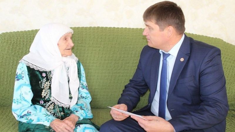Гадия апаны олы юбилее белән котларга район Башлыгы урынбасары Алексей Сарафанов килгән иде. Россия Президенты Владимир Путинның котлавын һәм район Башлыгы Марат Гафаровның бүләген җиткереп, исәнлек, хәерле гомерләр юллады ул юбилярга.