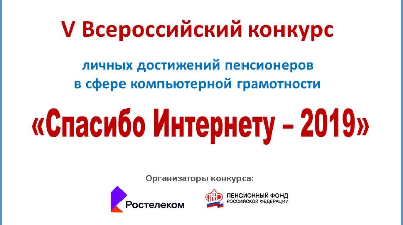 Россия Пенсионерлар берлеге пенсионерлар арасында цифрлы грамоталылыкны алга таба мавыктыру темасында актив эшли, конкурсны оештыру комитеты өлкән яшьтәге кешеләрне «Интернетка рәхмәт - 2019» компьютер грамоталылыгын үзләштерү V Бөтенроссия конкурсында катнашырга чакыра.