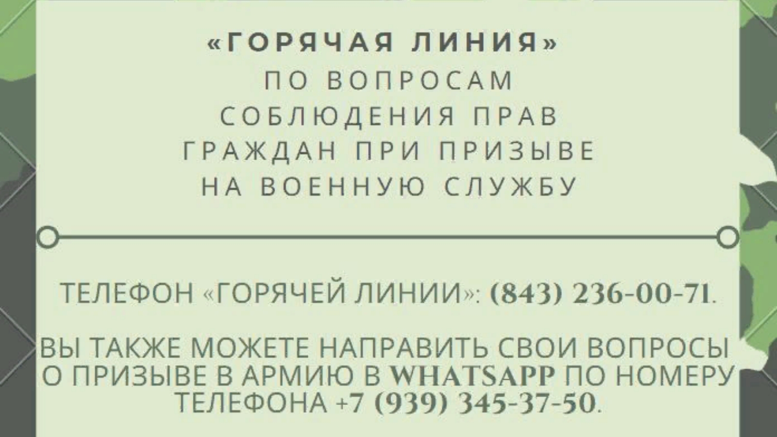 Сез шулай ук армиягә чакыруга кагылышлы сорауларыгызны WhatsAppка +7 (939) 345-37-50 номеры буенча җибәрә аласыз.