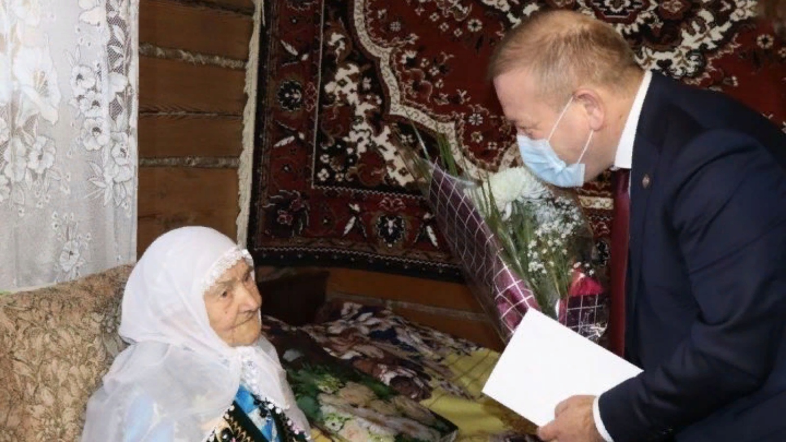 Марат Гафаров юбилярга тантаналы рәвештә Россия Президенты Владимир Путиннан котлау телеграммасы тапшырды, сугыш һәм сугыштан соңгы ил формалашу елларында күрсәткән хезмәтләре өчен рәхмәт белдереп, алдагы көннәрдә дә исән-имин яшәвен теләде.