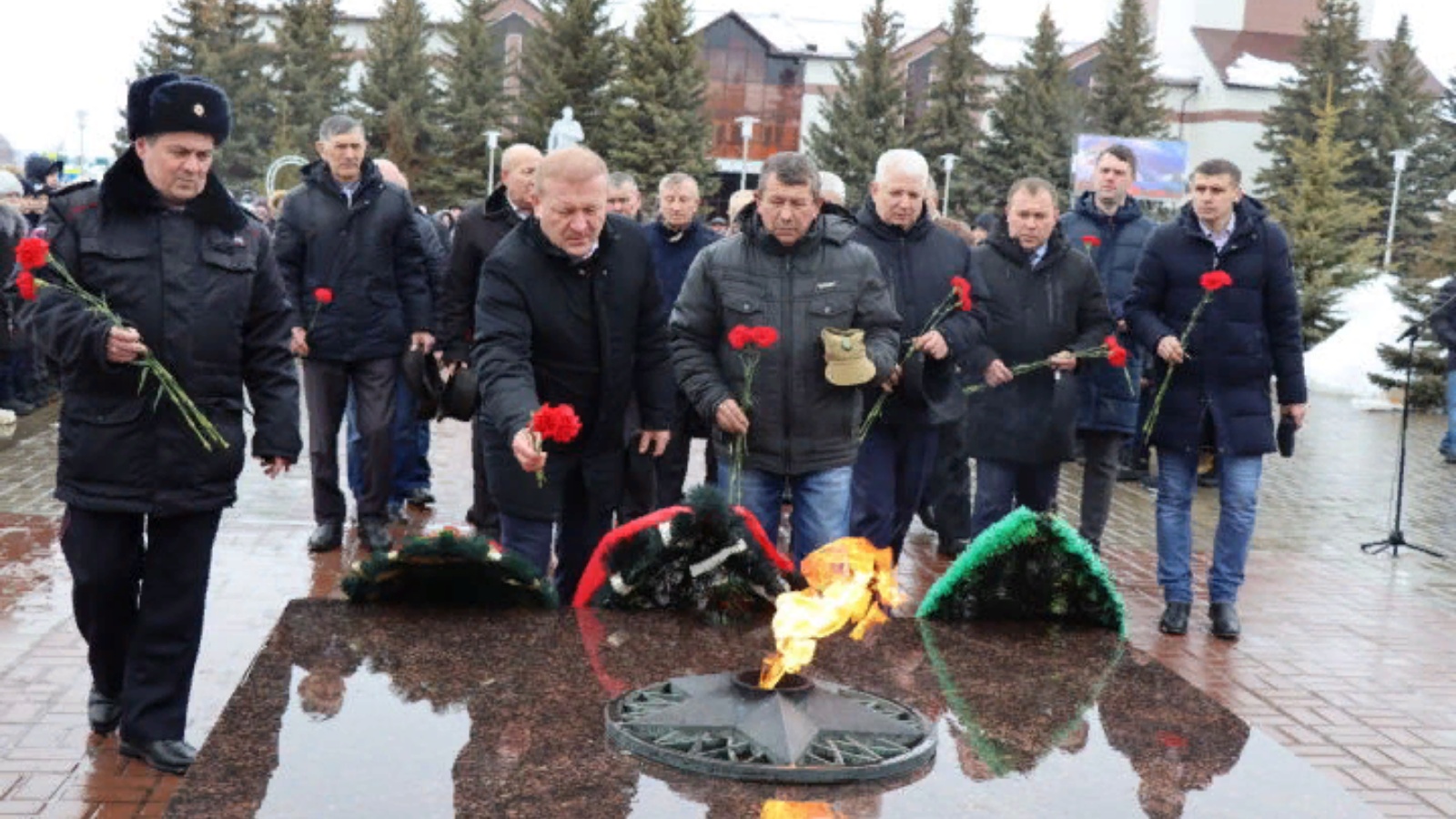 Җыелучылар Мәңгелек утка чәчәкләр салдылар һәм һәлак булган сугышчыларны бер минут тынлык белән искә алдылар.