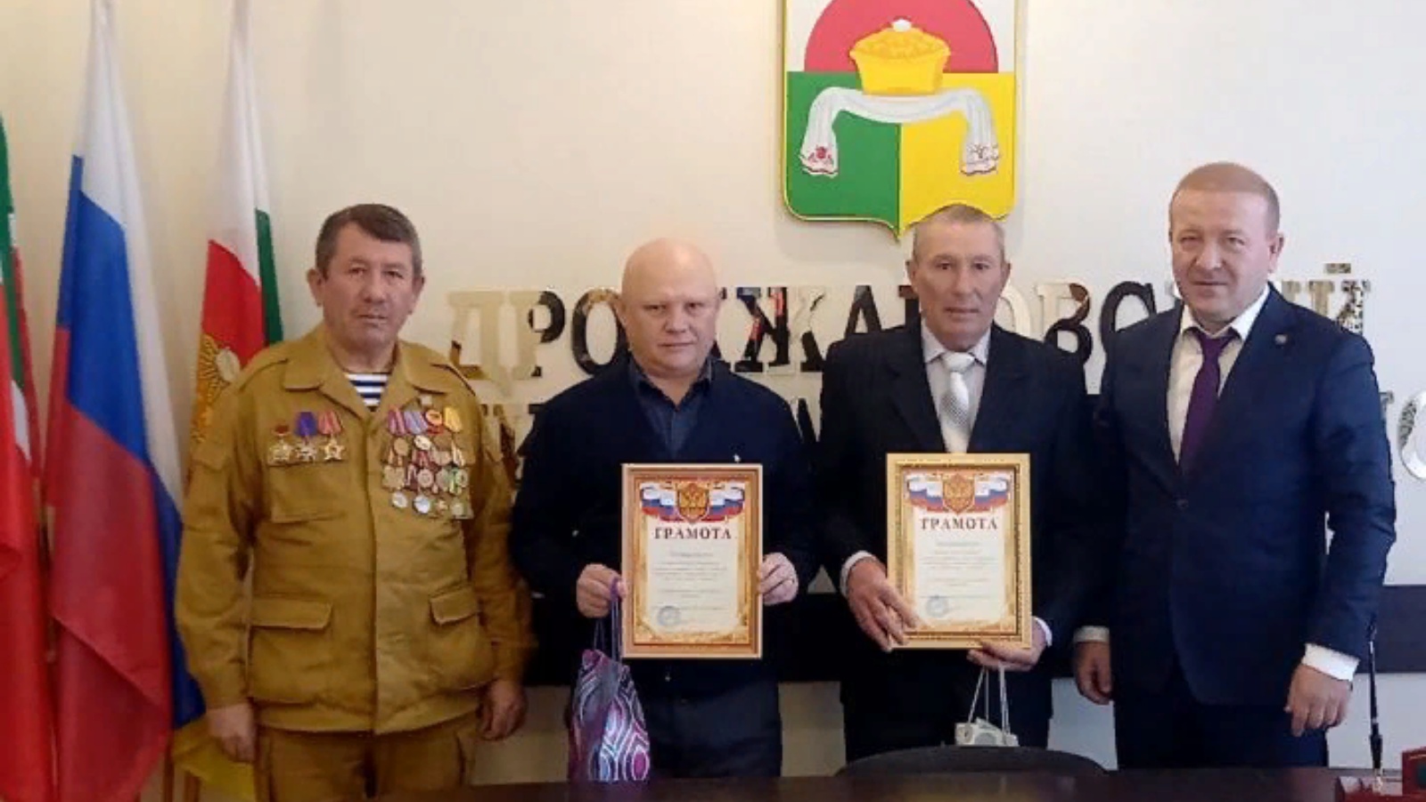 Район башлыгы Марат Гафаров һәм сугыш хәрәкәтләре ветераннары советы рәисе Виктор Петухов Владимир Кукушкин һәм Николай Хрисановны бәйрәм белән котладылар һәм аларга Россия сугыш хәрәкәтләре ветераннары Берлеге, идарә рәисе Е.Г. Кабыш исеменнән Грамоталар тапшырдылар.