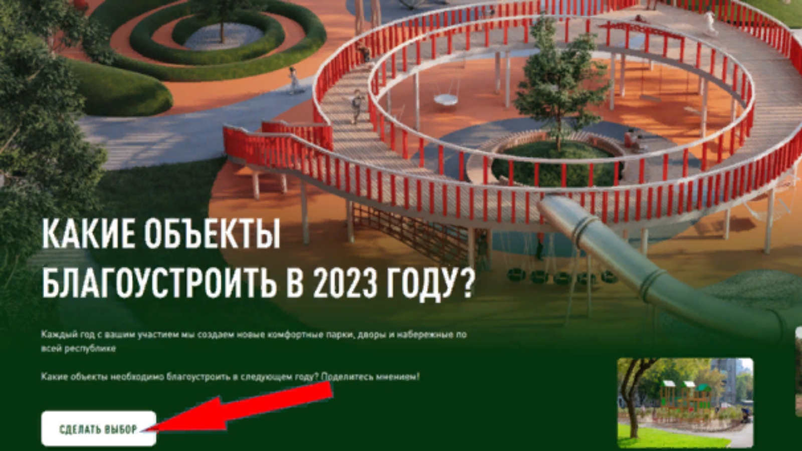 15 апрельдән Татарстанда киләсе елда төзекләндереләчәк паркларны һәм ишегалларын сайлау өчен сораштыру старт алды. Анда республиканың 45 районы катнаша. Татарстан Республикасы Дәүләт һәм муниципаль хезмәтләр Порталында «Халыктан сораштырулар» сервисы аша һәм «ТР Хезмәтләре» мобиль кушымтасында республиканың 14 яше тулган һәр гражданины теге яки бу иҗтимагый территория өчен тавыш бирә ала.