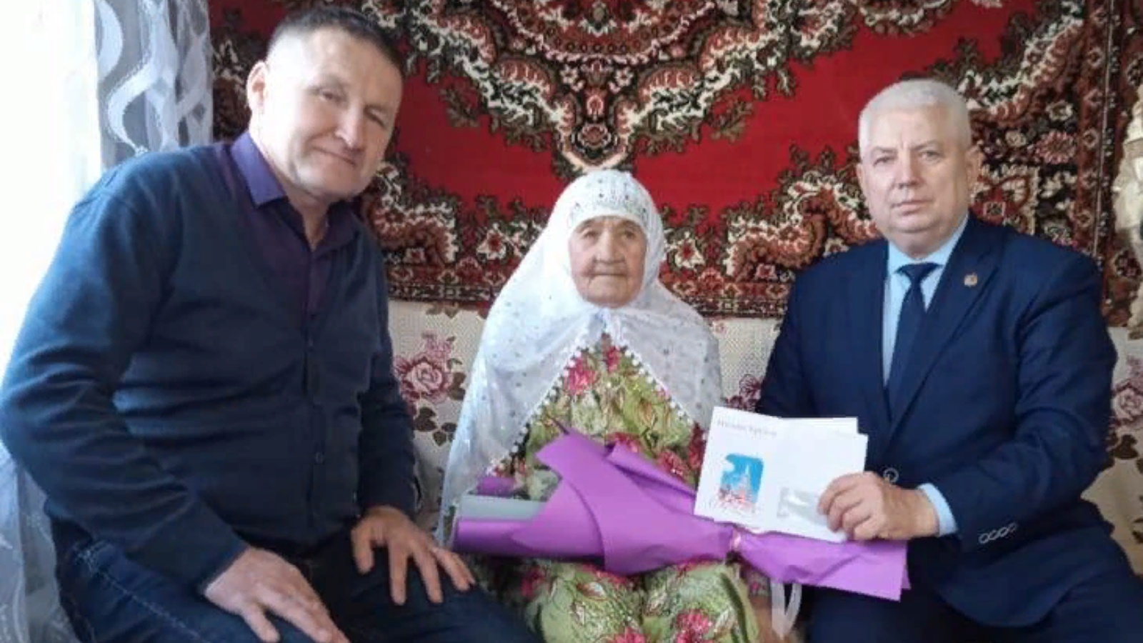 Юбилярны шундый истәлекле дата белән район башлыгы урынбасары Алексей Ярухин һәм Түбән Чәке авыл җирлеге башлыгы Олег Албутов котладылар. Кунаклар илебез өчен авыр елларда, сугыштан соңгы елларда күрсәткән хезмәт өчен рәхмәт белдерделәр, Россия Президенты Владимир Путин исеменнән Котлау хатын, Чүпрәле муниципаль районы башлыгы Марат Гафаров исеменнән бүләкләр тапшырылдылар.