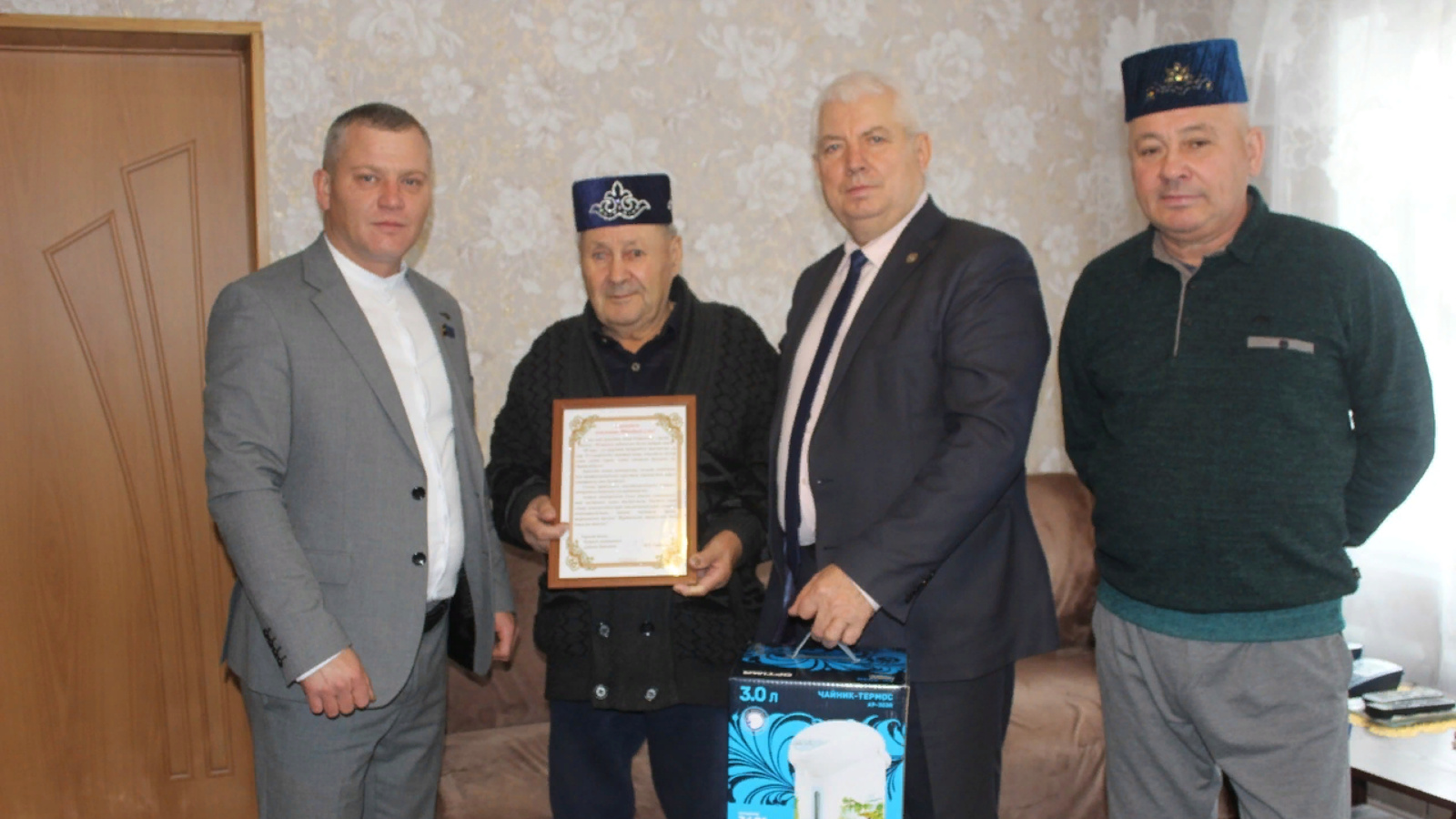 Бу көнне юбиляр район Башлыгы урынбасары Алексей Ярухиннан һәм Иске Чүпрәле авыл җирлеге башлыгы урынбасары Рамил Низамовтан җылы котлау сүзләрен кабул итте. Кунаклар ветеранны юбилее белән котладылар, аңа Чүпрәле муниципаль районы Башлыгы Марат Гафаров исеменнән котлау открыткасы, бүләкләр тапшырдылар, сәламәтлек, бәхет, озын гомер теләделәр.