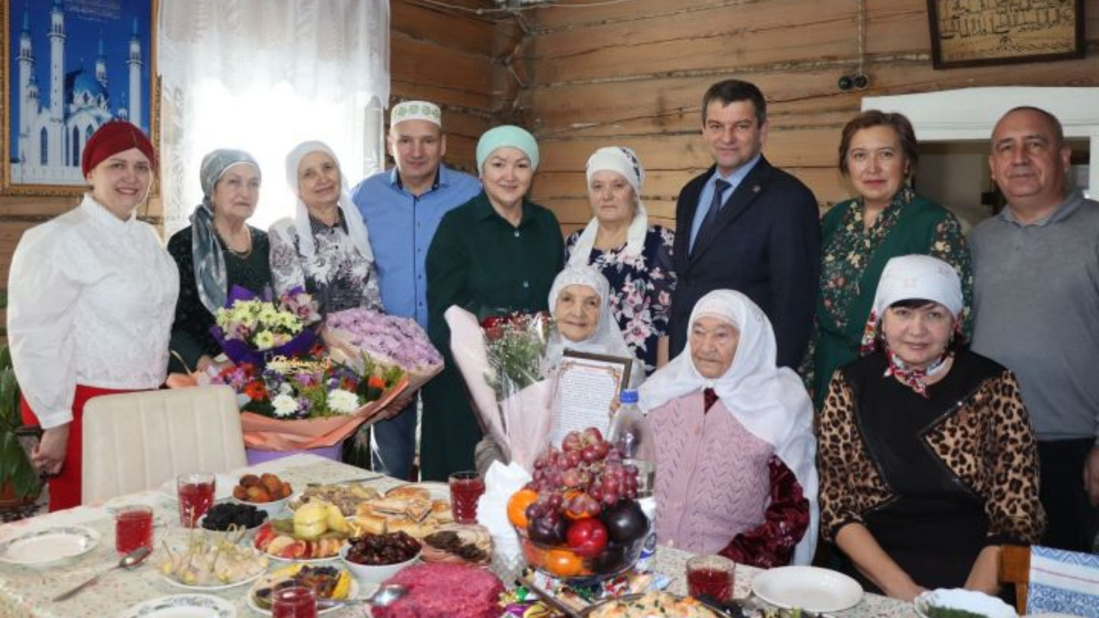 Бу көнне Зиннәтбану Хәлиуллина Татарстан Республикасы Чүпрәле муниципаль районы Башкарма комитеты җитәкчесе Рөстәм Мөхәмәтҗанов, Иске Шәйморза авыл җирлеге башлыгы Илһамия Мөхитовадан җылы котлау сүзләре кабул итте.