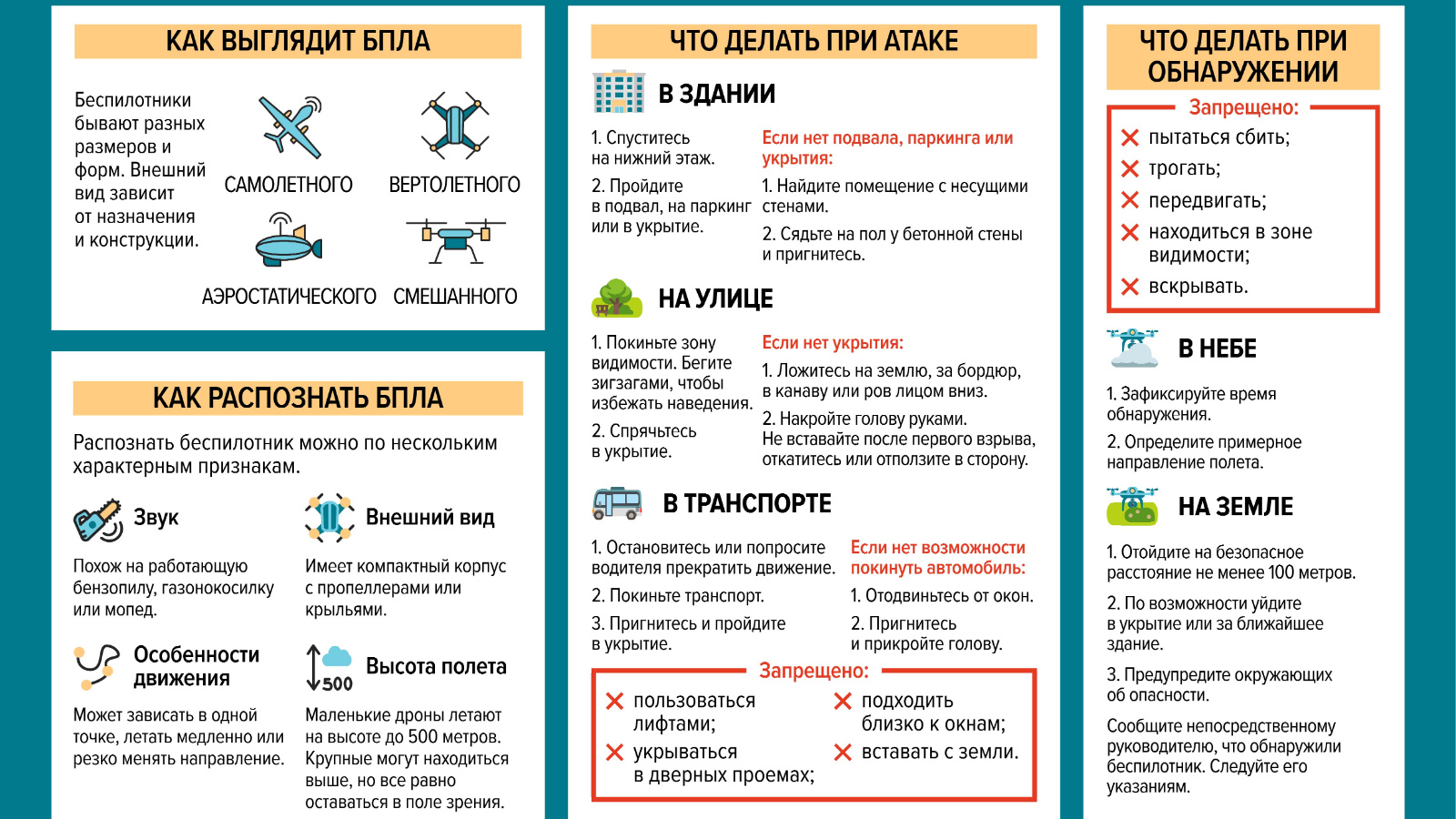«Отбой атаки БПЛА» сигналын алганчы яшеренү урыннарыннан чыкмаска һәм аларны ташлап китмәскә.