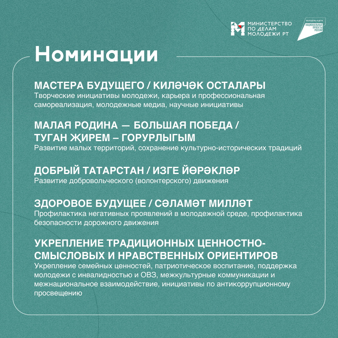 «Мастера будущего / Киләчәк осталары» - һөнәри үз-үзеңне тормышка ашыруга, яшьләр медиасын, фәнни, иҗади инициативаларын үстерүгә юнәлдерелгән проектлар кабул ителә;