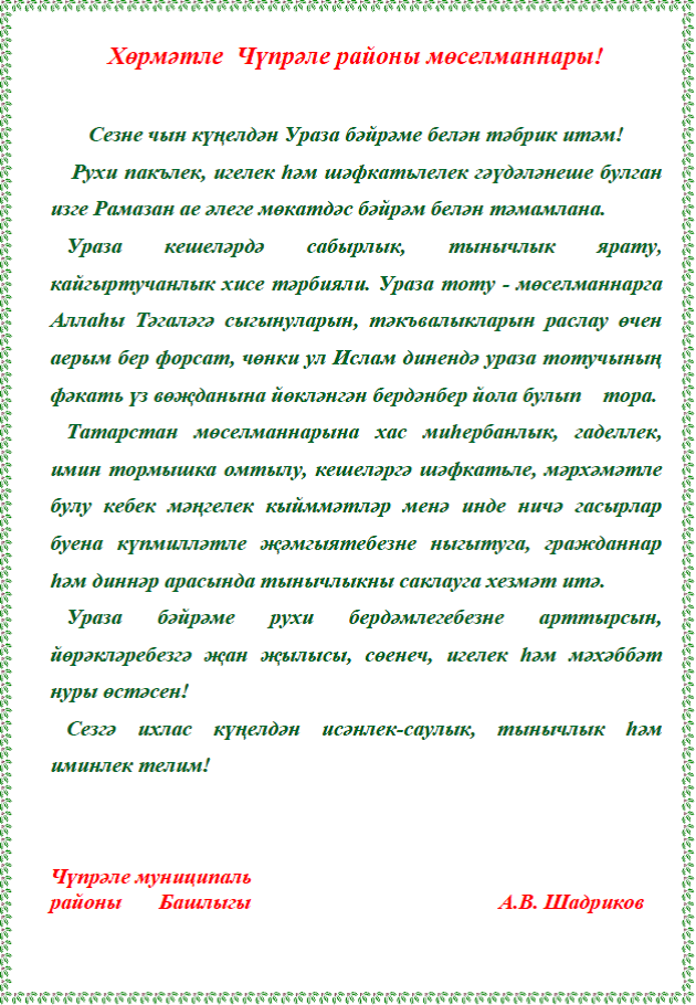 Чүпрәле муниципаль районы Башлыгы Александр Шадриковның Ураза гаете белән тәбрикләүе.